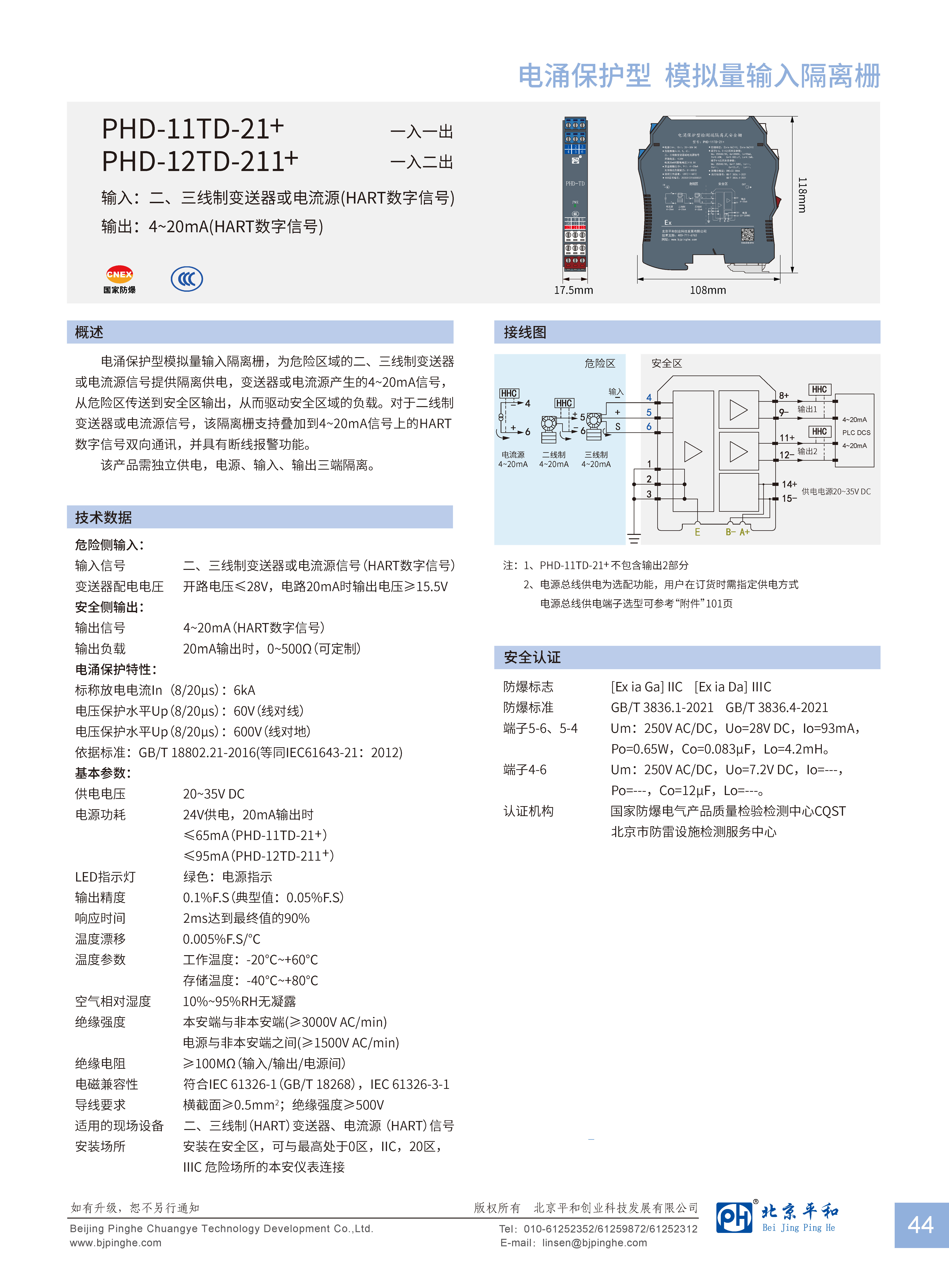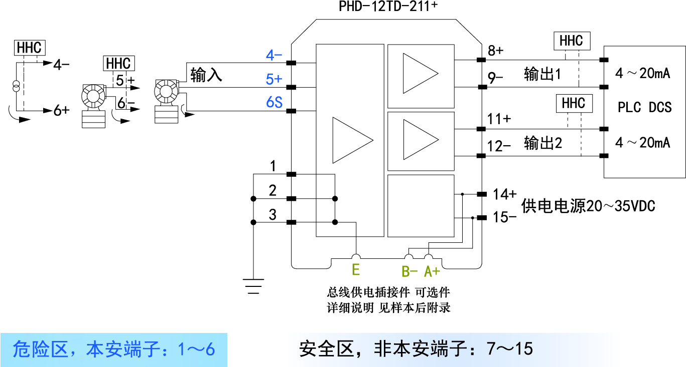 電涌保護型模擬量輸入隔離柵為危險區(qū)域的二、三線制變送器提供隔離供電,變送器或電流源產(chǎn)生的4~20mA信號,從危險區(qū)傳送到安全區(qū)輸出,從而驅(qū)動安全區(qū)域的負載。對于二、三線制變送器或電流源信號,該隔離柵支持疊加到4~20mA信號上的HART數(shù)字信號雙向通訊,并具有斷線報警功能。