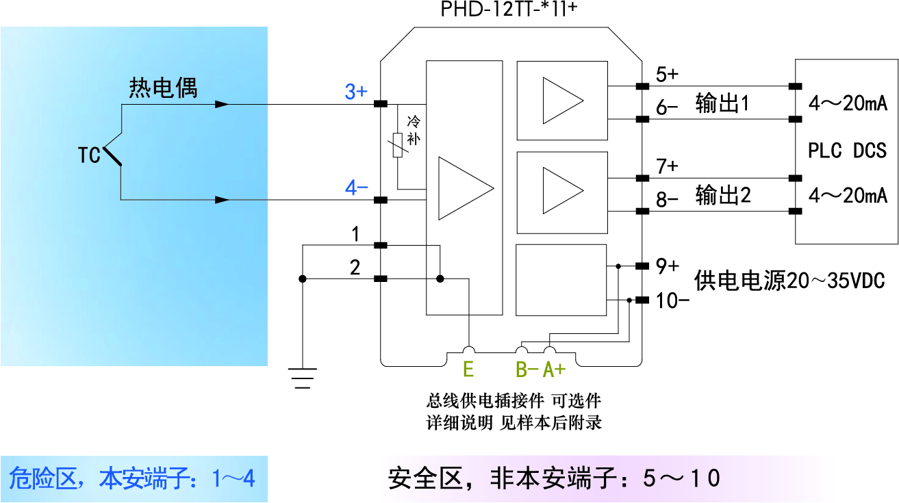 電涌保護(hù)型熱電偶輸入隔離柵,可將危險(xiǎn)區(qū)域內(nèi)熱電偶(TC)信號隔離轉(zhuǎn)換為4-20mA電流信號,輸出到安全區(qū)。此隔離柵內(nèi)置冷端補(bǔ)償,可智能組態(tài),熱電偶的實(shí)際量程范圍可通過計(jì)算機(jī)軟件進(jìn)行設(shè)定。具有斷線報(bào)警和超出量程范圍報(bào)警功能。