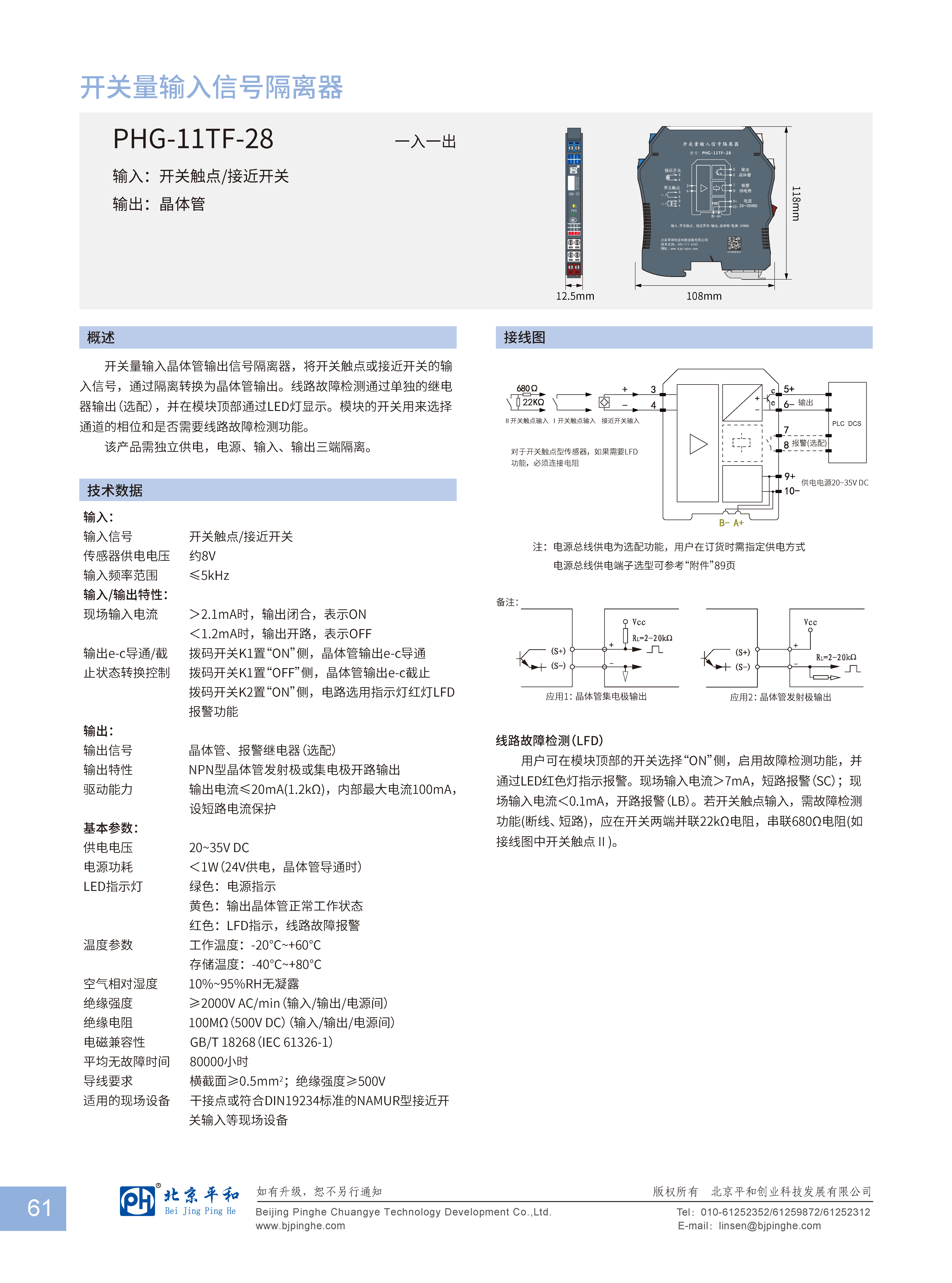 開關(guān)量輸入晶體管輸出信號隔離器,將開關(guān)觸點(diǎn)或接近開關(guān)的輸入信號,通過隔離轉(zhuǎn)換為晶體管輸出。線路故障檢測通過單獨(dú)的繼電器輸出(選配),并在模塊頂部通過LED燈顯示。模塊的開關(guān)用來選擇通道的相位和是否需要線路故障檢測功能。
