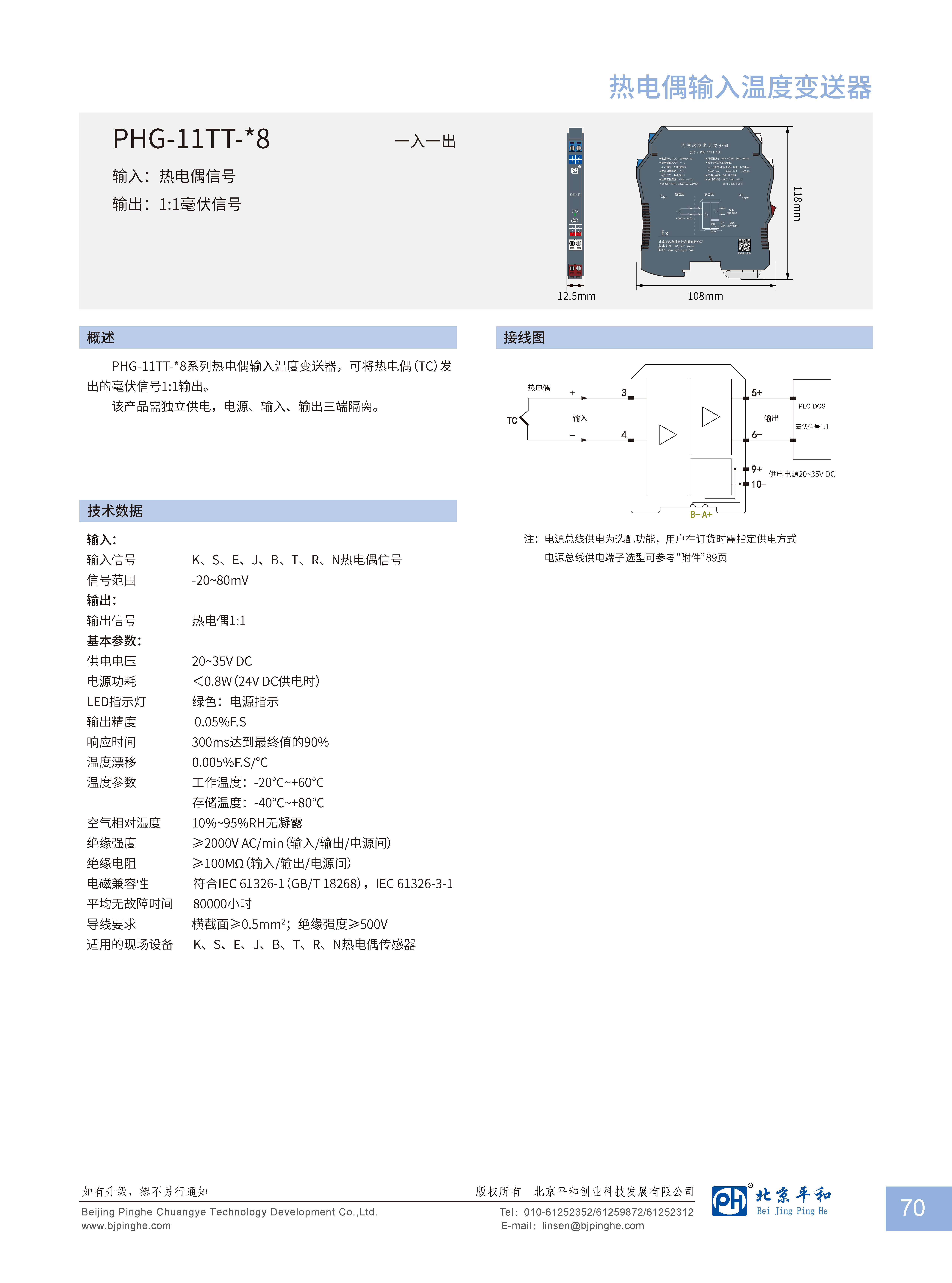 PHG-11TT-*8系列熱電偶輸入溫度變送器,可將熱電偶(TC)發(fā)出的毫伏信號1:1輸出。