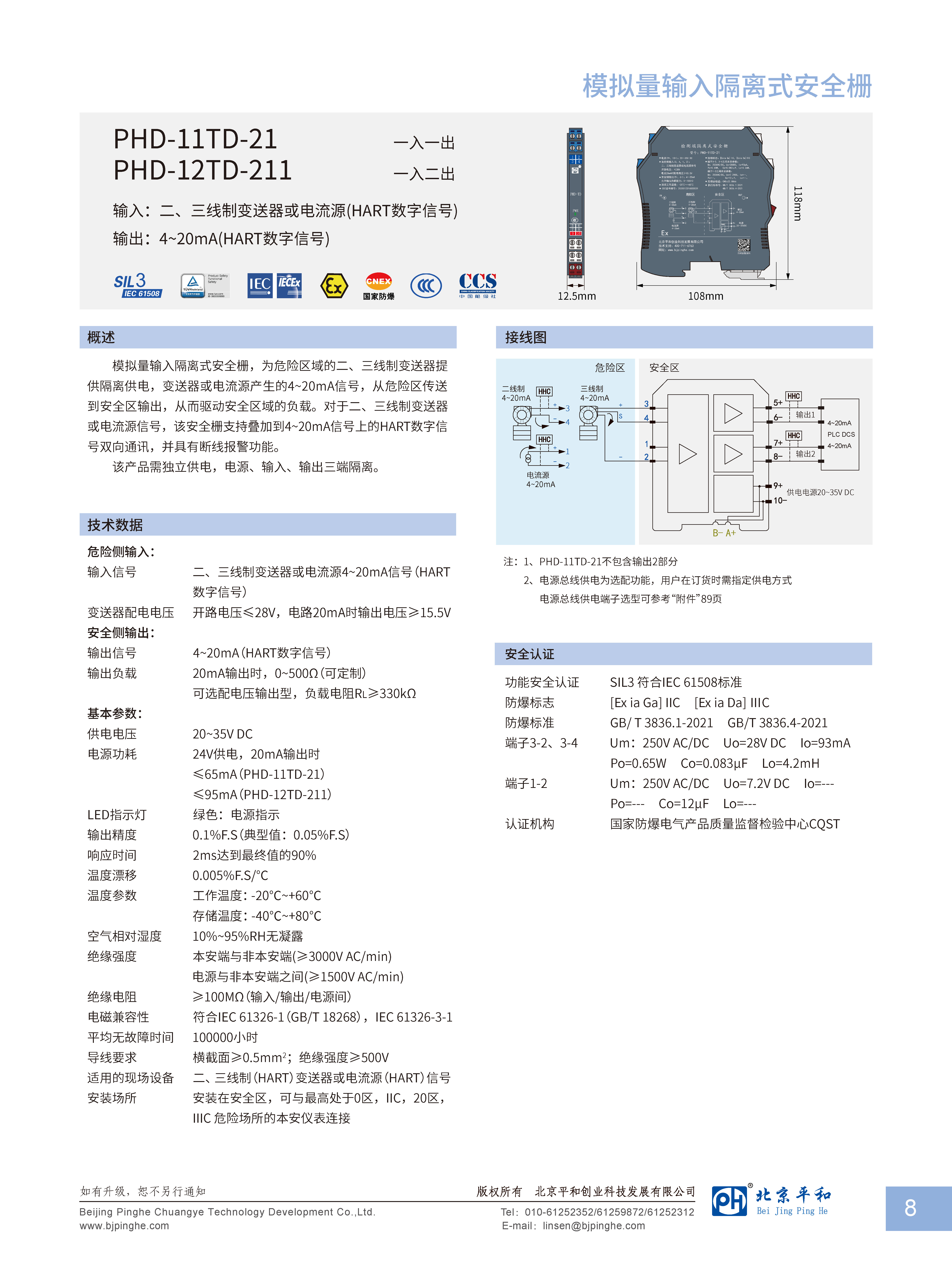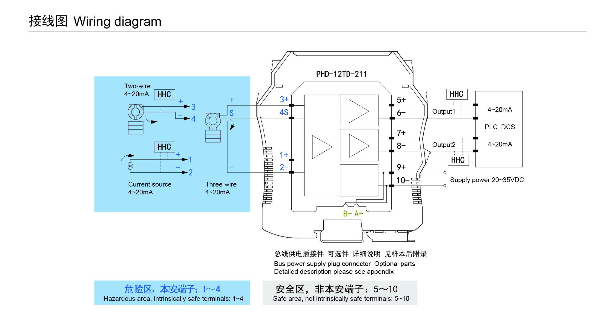 模擬量輸入隔離式安全柵為危險(xiǎn)區(qū)域的二、三線制變送器提供隔離供電,變送器或電流源產(chǎn)生的4~20mA信號(hào),從危險(xiǎn)區(qū)傳送到安全區(qū)輸出,從而驅(qū)動(dòng)安全區(qū)域的負(fù)載。對(duì)于二、三線制變送器或電流源信號(hào),該安全柵支持疊加到4~20mA信號(hào)上的HART數(shù)字信號(hào)雙向通訊,并具有斷線報(bào)警功能。