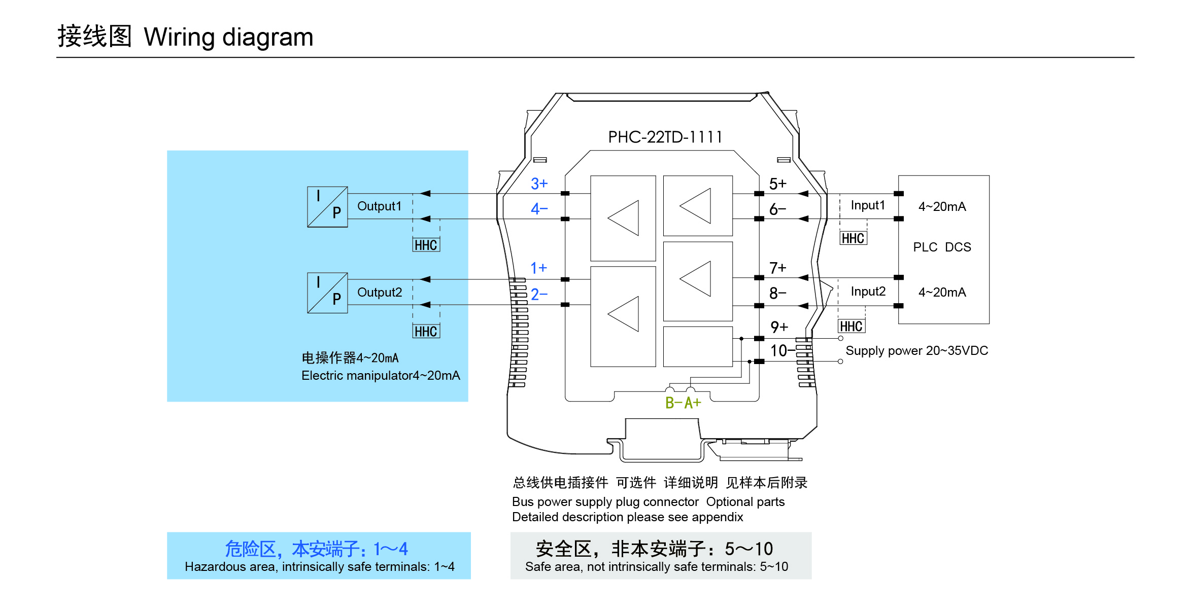| 供電電壓 | 20-35VDC,功耗約2W (24VDC供電,輸出20mA時(shí)) |