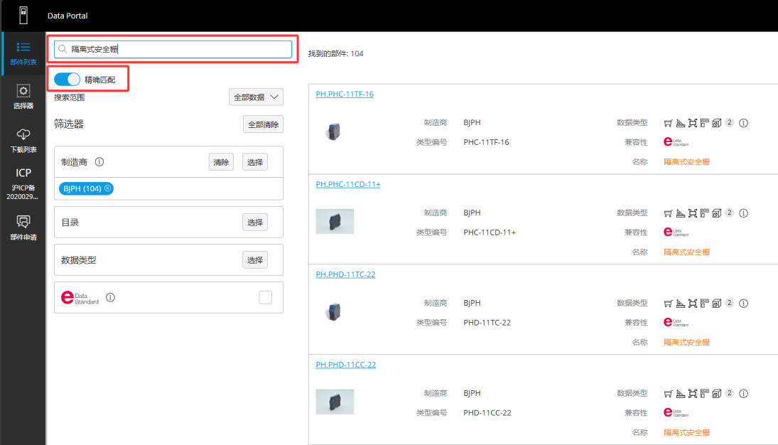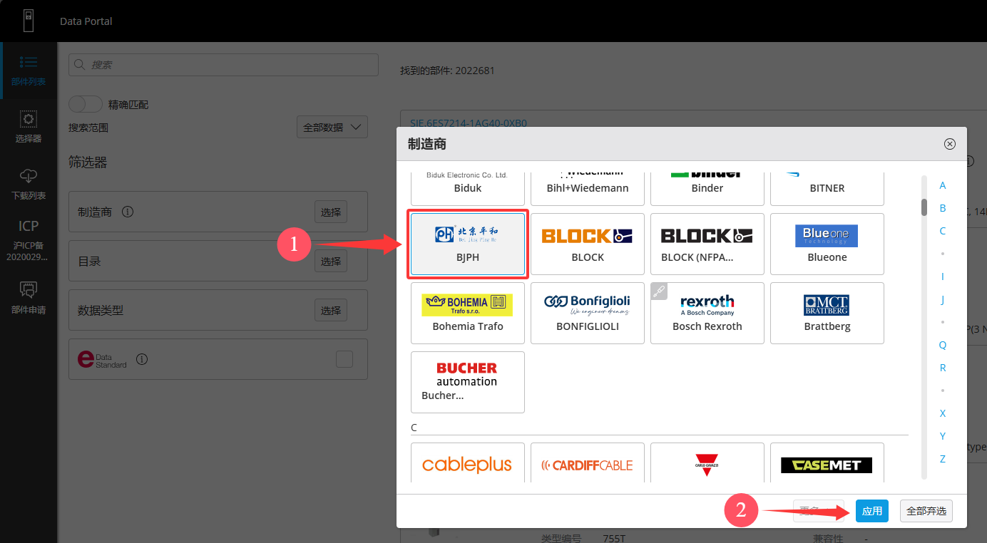 在Eplan Data Portal平臺(tái)中,點(diǎn)擊制造商選擇按鈕,選擇北京平和logo,點(diǎn)擊應(yīng)用。