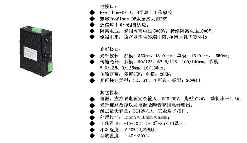 *支持Profibus-DP工業(yè)控制現(xiàn)場總線協(xié)議。通信速率(~6M自適應(yīng)。光纖最遠(yuǎn)通信距離可達(dá)60KM。