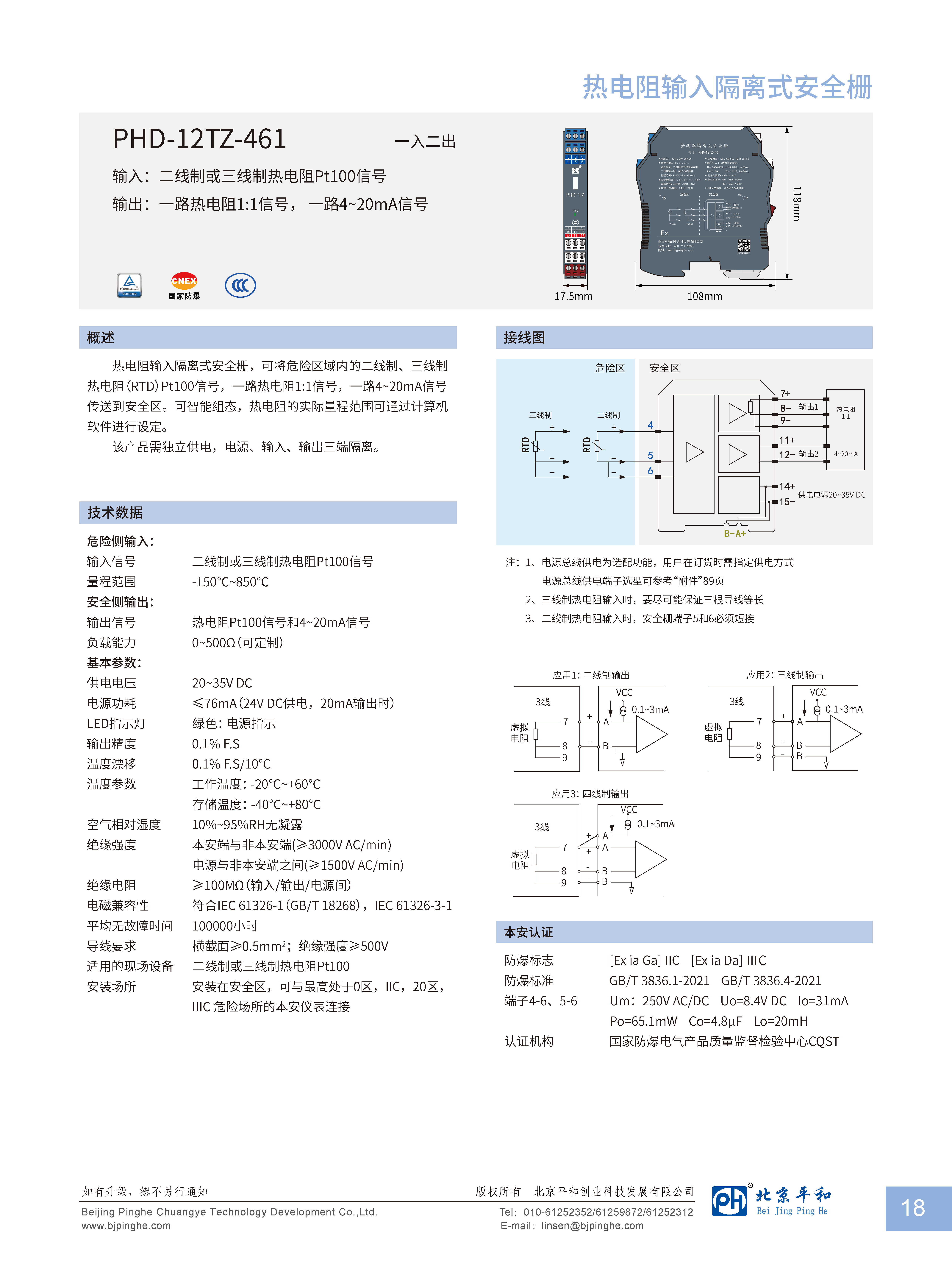 熱電阻輸入隔離式安全柵,可將危險區(qū)域內(nèi)的二線制、三線制熱電阻(RTD)Pt100信號,一路熱電阻1:1信號,一路4~20mA信號傳送到安全區(qū)??芍悄芙M態(tài),熱電阻的實際量程范圍可通過計算機軟件進行設定。
