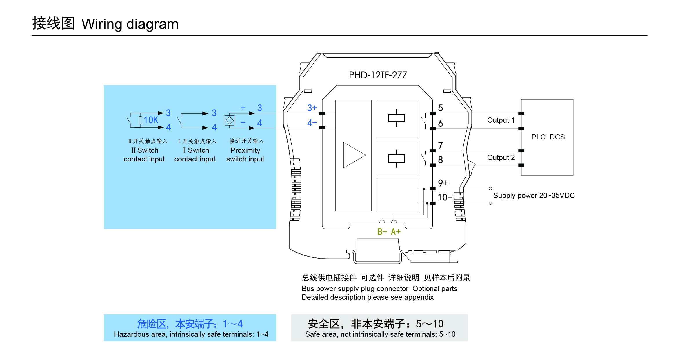 | 指示燈報警功能 | 現(xiàn)場輸入電流>7mA,短路報警(SC),現(xiàn)場輸入電流<0.1mA,開路報警(LB)開關觸點輸入,需斷線檢測功能時,須在開關兩端并聯(lián)10KΩ電阻(如下圖接線圖中開關觸點Ⅱ) |