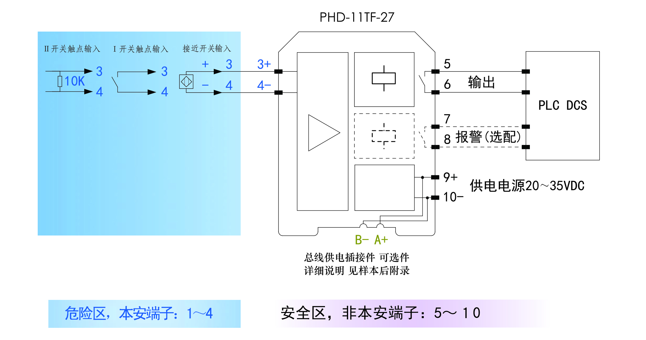 開關(guān)量輸入繼電器輸出隔離式安全柵,將來自危險區(qū)的開關(guān)觸點(diǎn)或接近開關(guān)的輸入信號,通過安全柵隔離傳輸?shù)桨踩珔^(qū)繼電器輸出。線路故障檢測通過單獨(dú)的繼電器輸出,并在模塊頂部LED燈顯示。模塊的撥碼開關(guān)用來設(shè)置輸入和輸出同相或反相控制,以及設(shè)置開啟或關(guān)閉線路故障檢測報警指示功能。