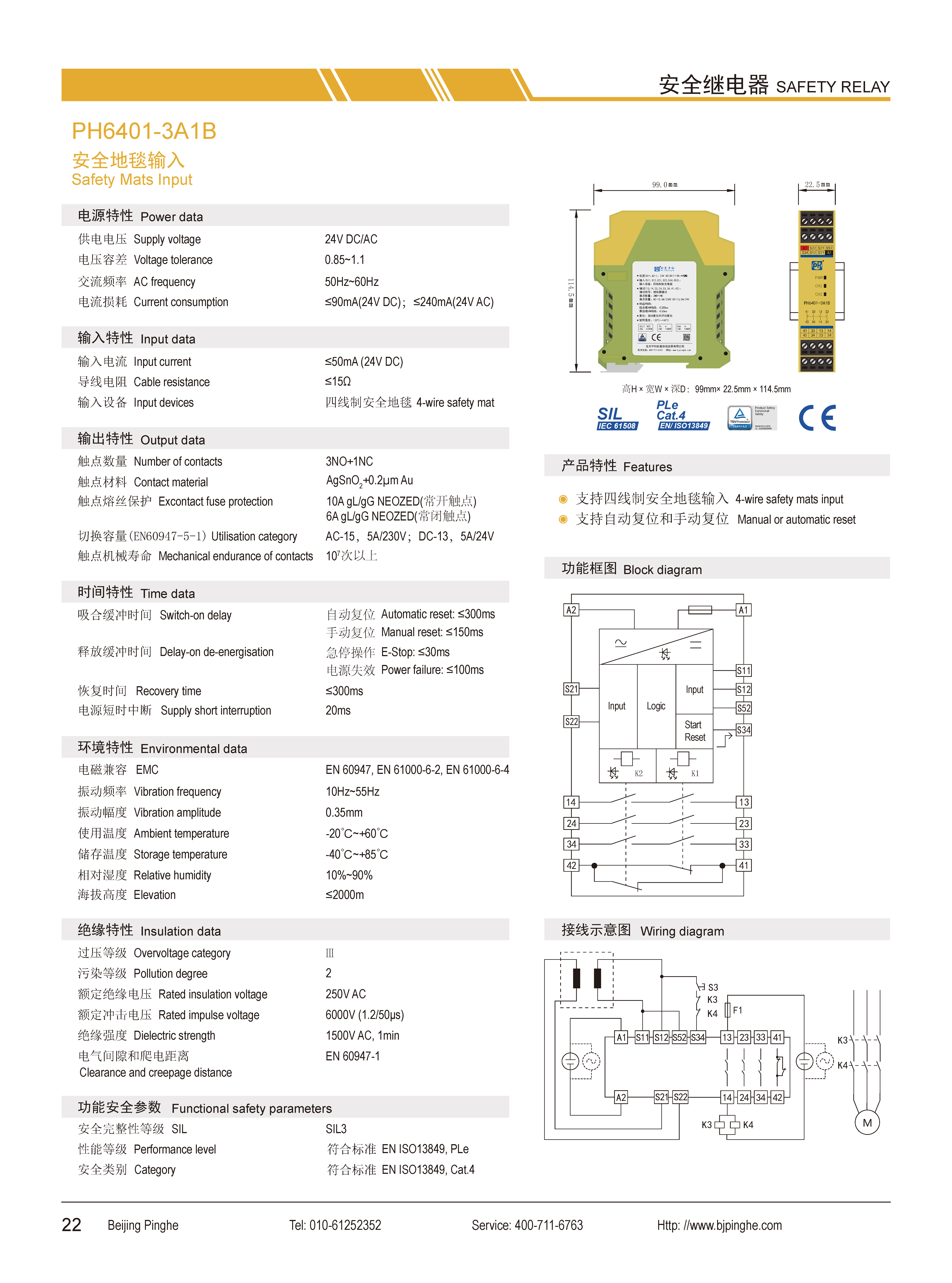 PH6401-3A1B是一款安全繼電器控制模塊,適用于安全地毯輸入,具有3路常開(NO)安全輸出觸點(diǎn)和1路常閉(NC)輔助輸出觸點(diǎn)的安全繼電器。它支持雙通道操作,手動或自動復(fù)位功能。