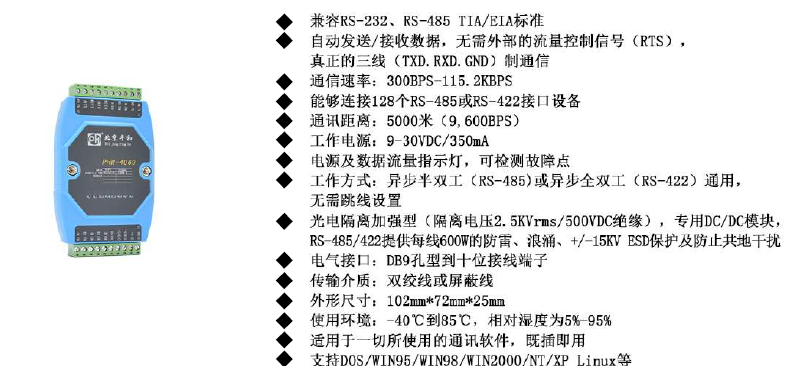 | 工作方式 | 異步半雙工(RS-485)或異步全雙工(RS-422)通用,無需跳線設(shè)置 |