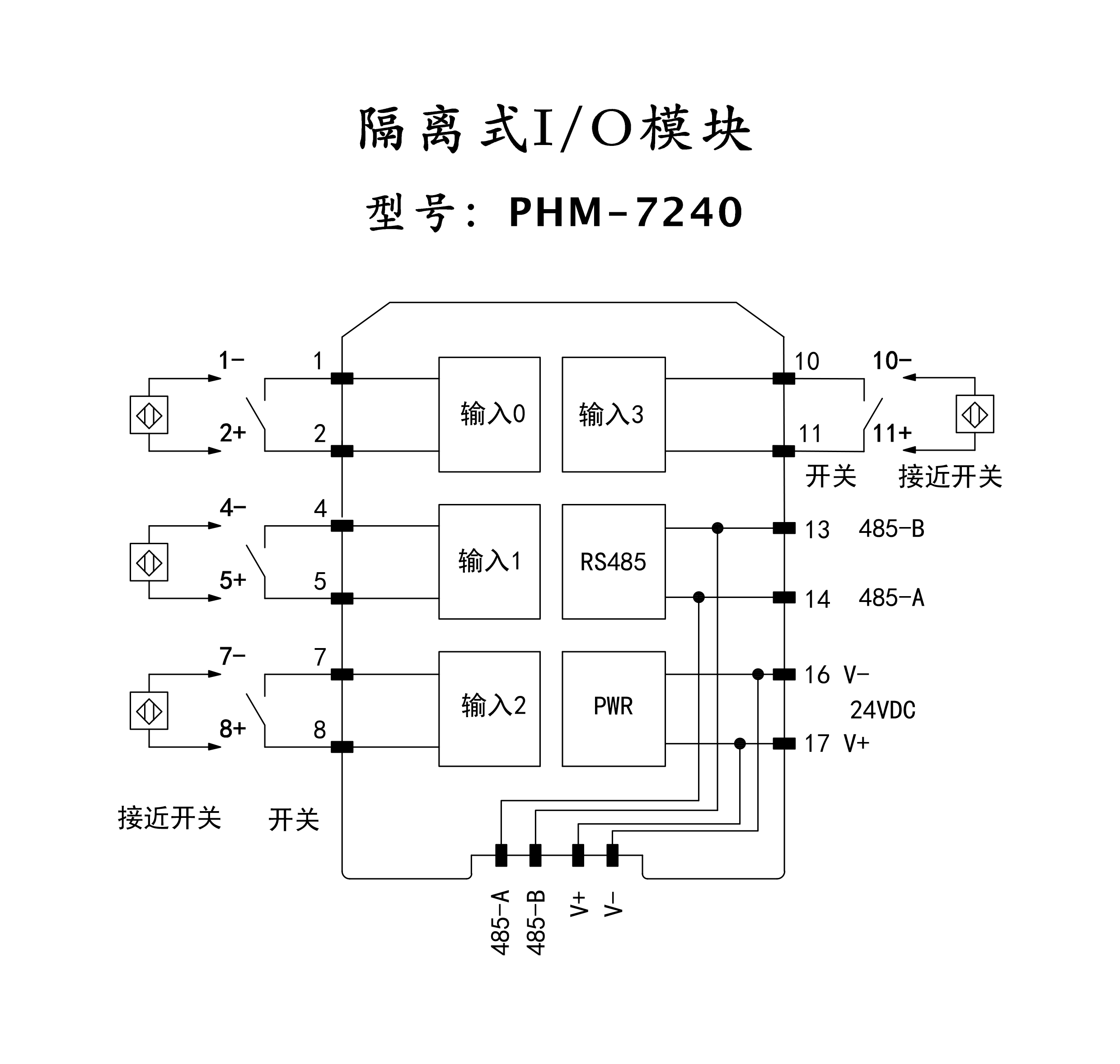 將工業(yè)現(xiàn)場的4路開關(guān)量分別隔離轉(zhuǎn)換為數(shù)字信號,按照MODBUS 規(guī)約,通過RS485通訊方式, 將數(shù)字信號提供給PHM-7100,PLC或上位機等控制器或數(shù)據(jù)采集系統(tǒng)。完善的隔離設(shè)計理念非常適合工業(yè)現(xiàn)場的復雜工況,長期穩(wěn)定性好,每路提供隔離的觸點檢測電源,增加了觸點檢測的可靠性、抗干擾性能優(yōu)異。