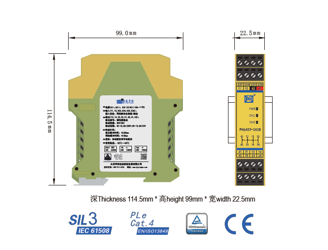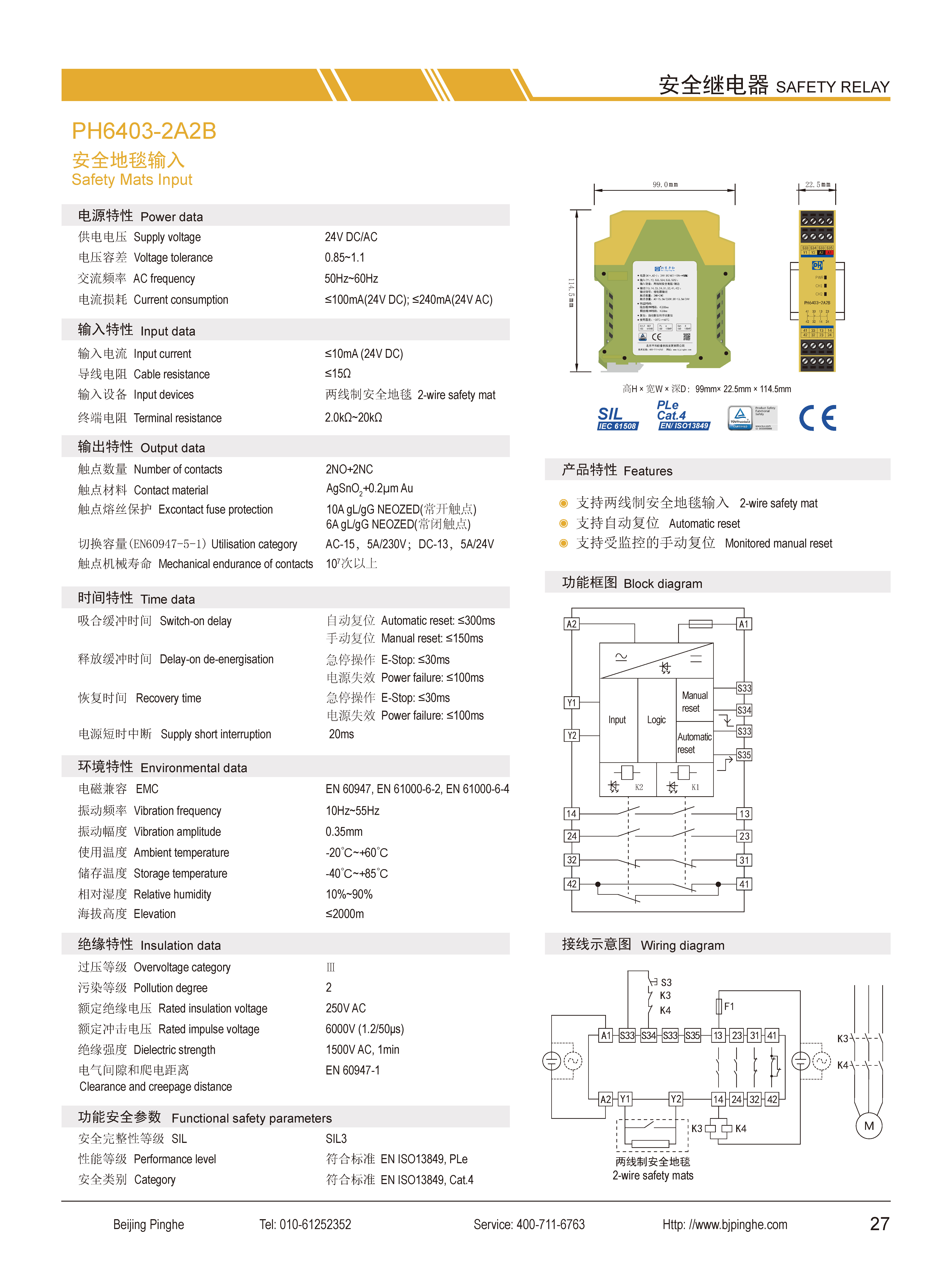 PH6403-2A2B是一款安全繼電器控制模塊,適用于兩線制安全地毯輸入,具有2路常開(NO)安全輸出觸點和2路常閉(NC)輔助輸出觸點的安全繼電器。它支持手動或自動復(fù)位,并具有復(fù)位按鈕監(jiān)控功能。