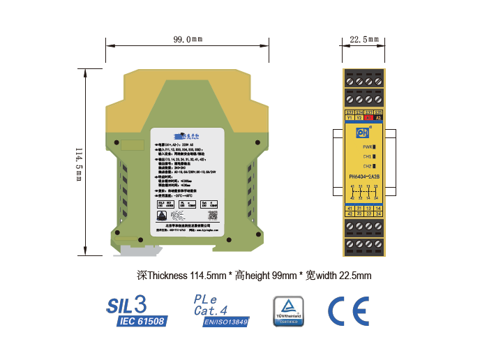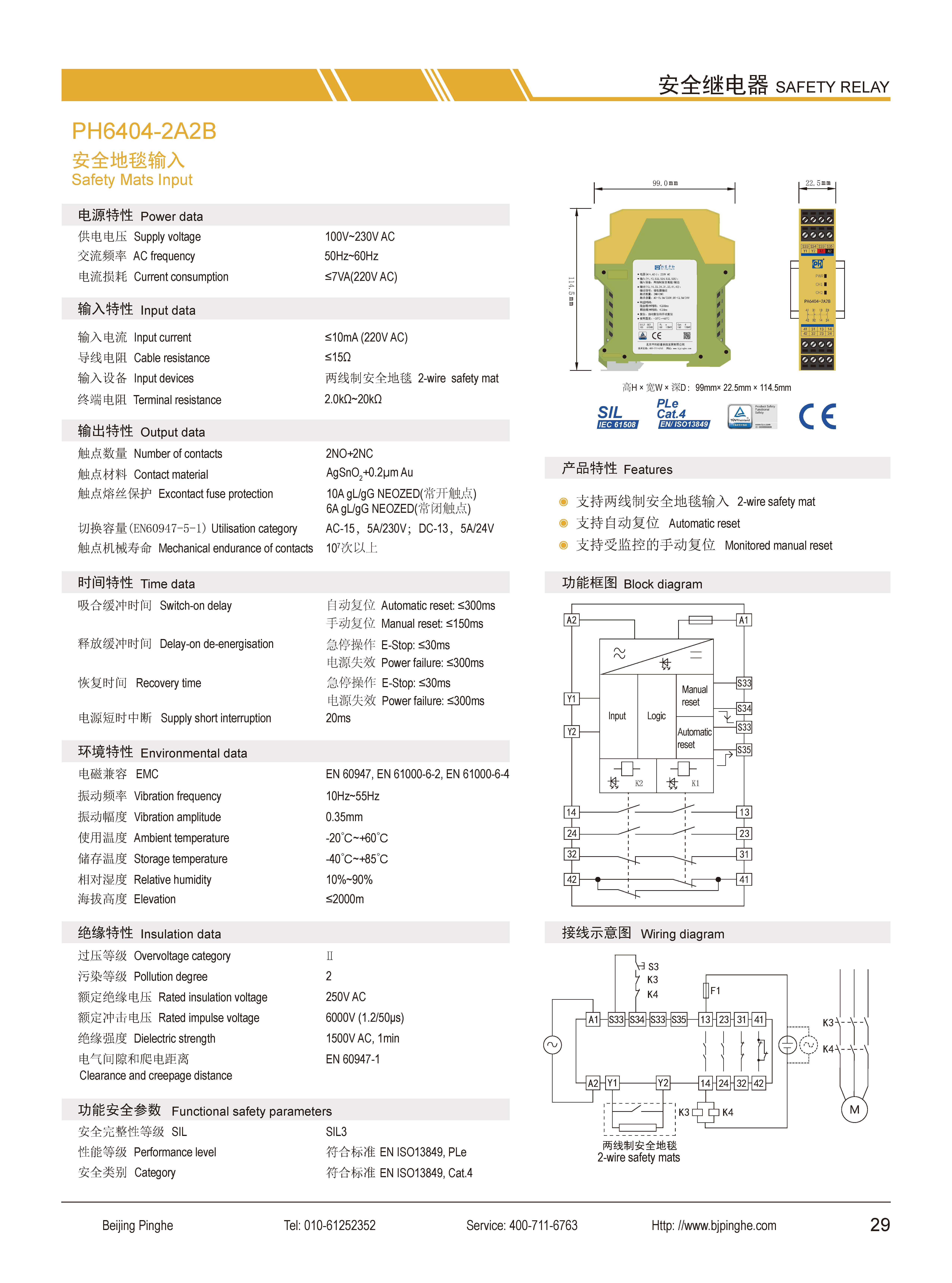 PH6403-2A2B是一款安全繼電器控制模塊,適用于兩線制安全地毯輸入,具有2路常開(NO)安全輸出觸點和2路常閉(NC)輔助輸出觸點的安全繼電器。它支持手動或自動復(fù)位,并具有復(fù)位按鈕監(jiān)控功能。