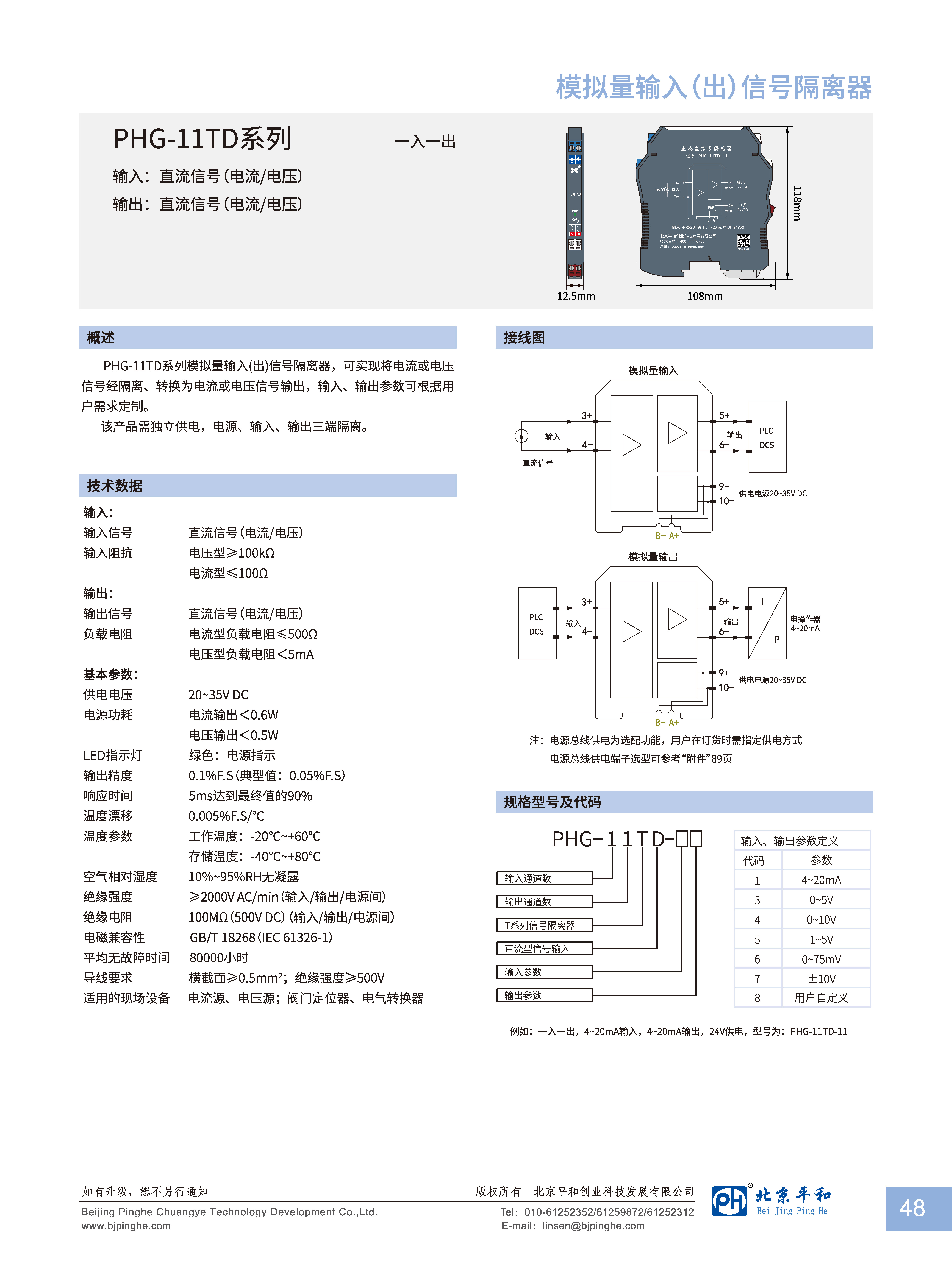 PHG-11TD系列模擬量輸入(出)信號(hào)隔離器,可實(shí)現(xiàn)將電流或電壓信號(hào)經(jīng)隔離、轉(zhuǎn)換為電流或電壓信號(hào)輸出,輸入、輸出參數(shù)可根據(jù)用戶需求定制。