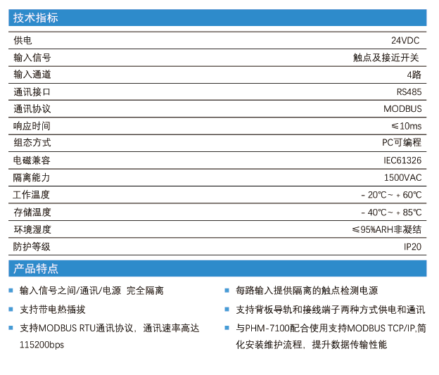 將工業(yè)現(xiàn)場的4路開關量分別隔離轉換為數(shù)字信號,按照MODBUS規(guī)約,通過RS485通訊方式,將數(shù)字信號提供給PHM-7100,PLC或上位機等控制器或數(shù)據(jù)采集系統(tǒng)。完善的隔離設計理念非常適合工業(yè)現(xiàn)場的復雜工況,長期穩(wěn)定性好,每路提供隔離的觸點檢測電源,增加了觸點檢測的可靠性、抗干擾性能優(yōu)異。