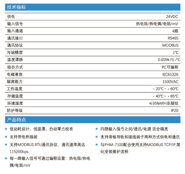 將工業(yè)現(xiàn)場(chǎng)的四路熱電偶/熱電阻/電阻/mV轉(zhuǎn)換為數(shù)字信號(hào),按照MODBUS規(guī)約, 通過(guò)RS 485通訊方式, 將數(shù)字信號(hào)提供給PHM-7100, PLC或上位機(jī)等控制器或數(shù)據(jù)采集系統(tǒng)。與傳統(tǒng)的PLC+隔離器的輸出模式比較,減少了兩次轉(zhuǎn)換誤差,在顯著提高轉(zhuǎn)換精度的同時(shí),增加了系統(tǒng)的穩(wěn)定性和抗干擾性。
