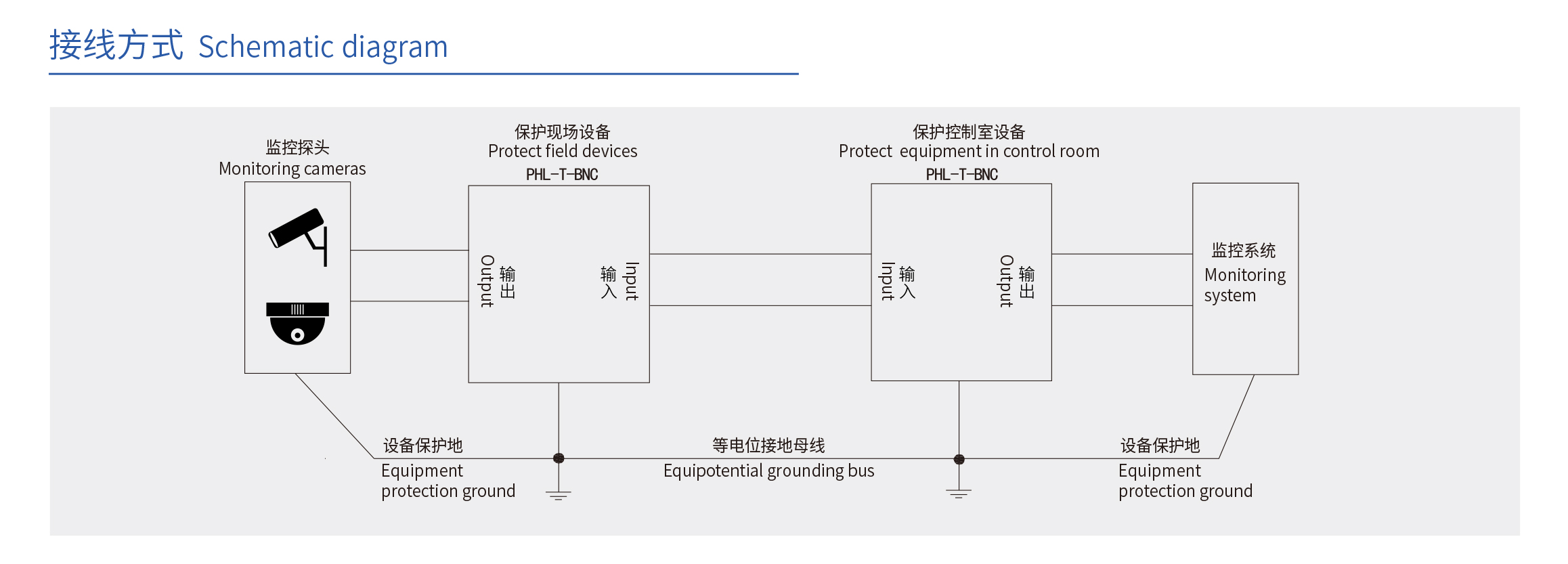 標(biāo)準(zhǔn)BNC同軸接口,用于標(biāo)清同軸視頻監(jiān)控系統(tǒng)的防雷保護(hù)。