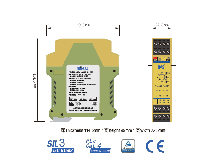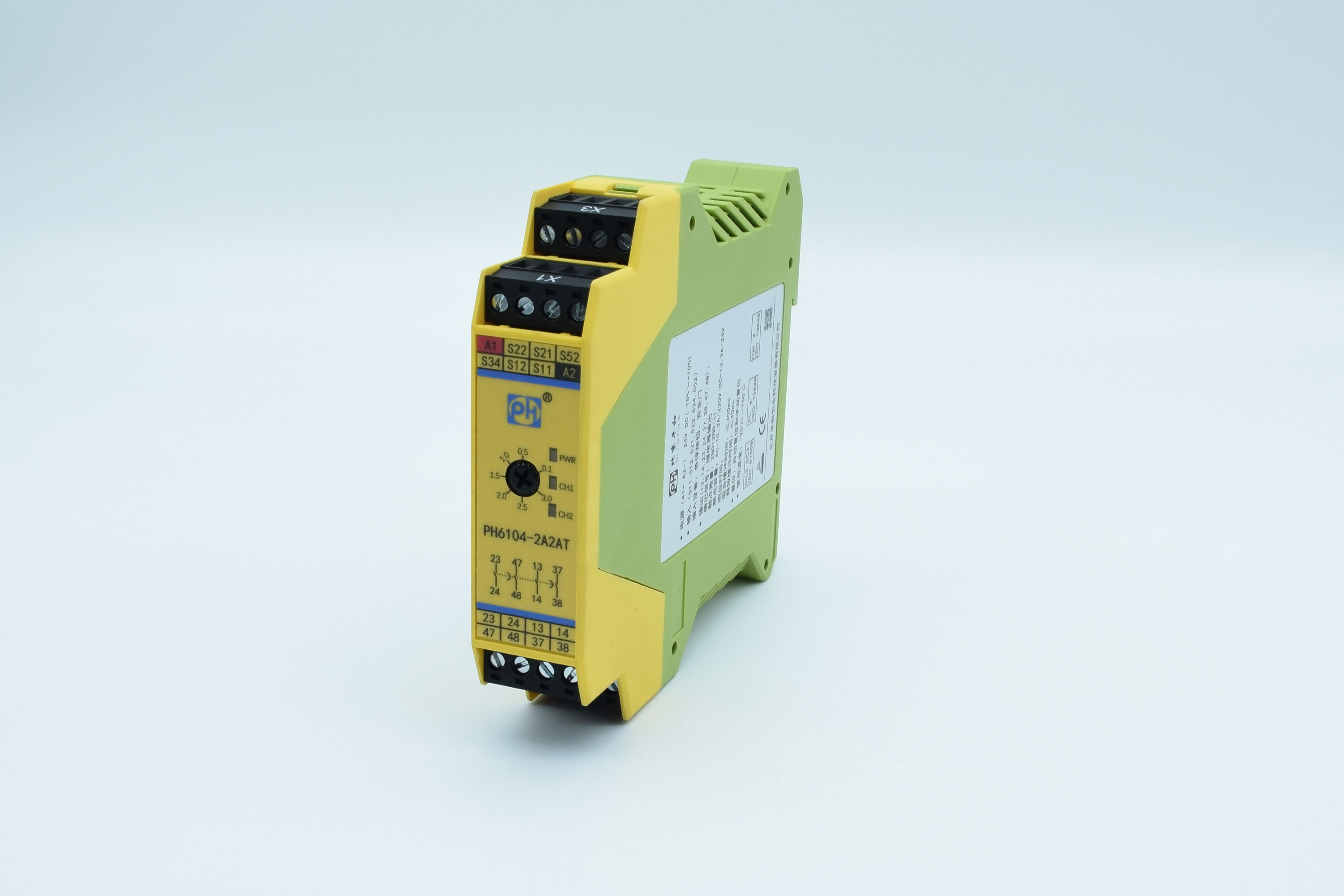 PH6104-2A2AT是一款安全繼電器控制模塊,適用于急停按鈕、安全門控制開關(guān)輸入,具有2路非延時常開(NO)安全輸出觸點和2路延時常開(NO)安全輸出觸點的安全繼電器。它可選擇單,雙通道操作,手動或自動復(fù)位,并具有通道間短路監(jiān)控功能。
