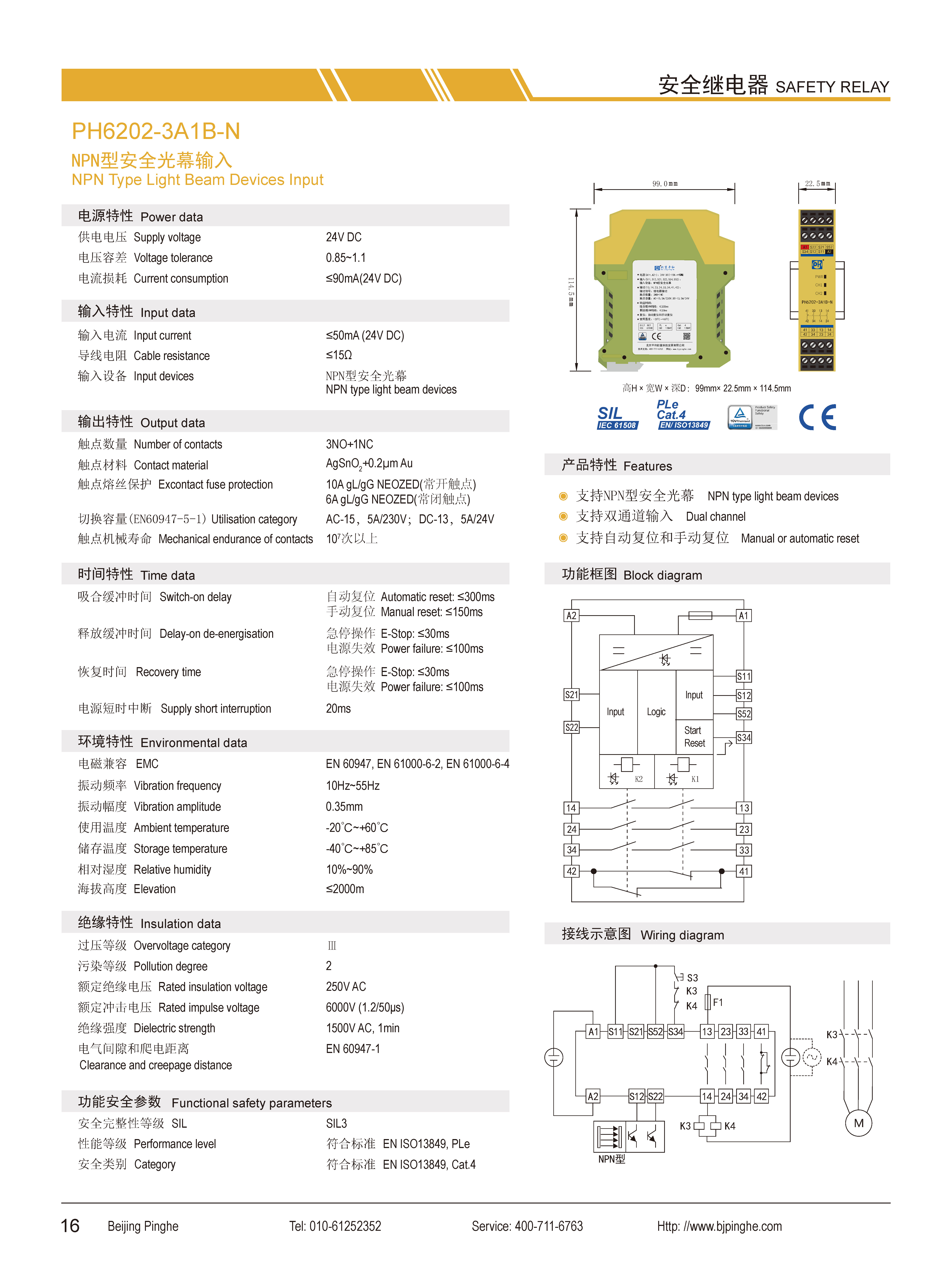 PH6202-3A1B-N是一款安全繼電器控制模塊,適用于NPN型安全光幕輸入,具有3路常開(NO)安全輸出觸點(diǎn)和1路常閉(NC)輔助輸出觸點(diǎn)的安全繼電器。它支持雙通道操作,可選擇手動(dòng)或自動(dòng)復(fù)位。