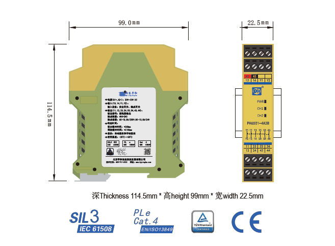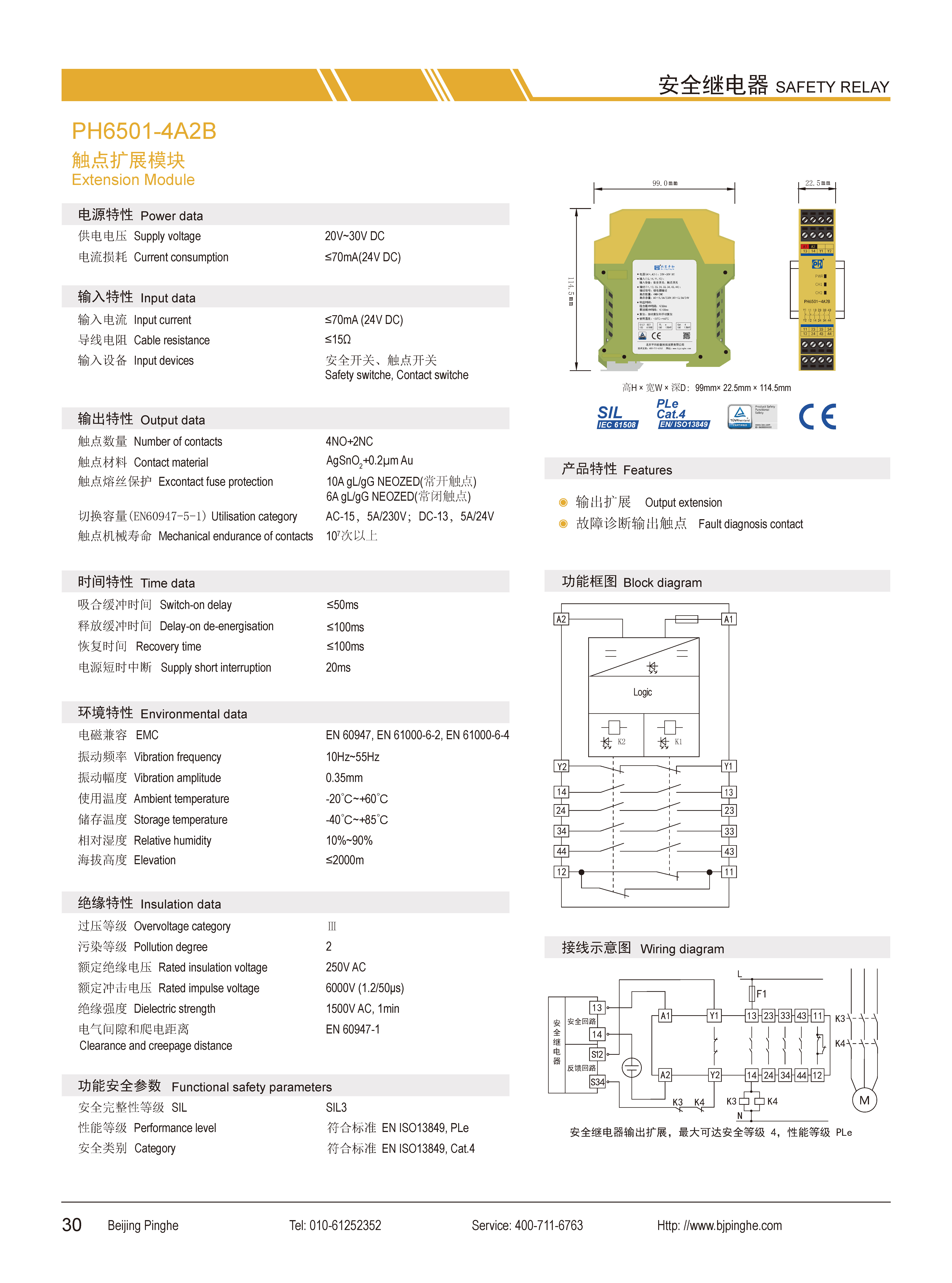 PH6501-4A2B是一款安全繼電器輸出擴(kuò)展模塊,它接收現(xiàn)場的安全開關(guān)信號,并擴(kuò)展為4路常開(NO)安全輸出觸點和2路常閉(NC)輔助輸出觸點,2路輔助觸點可分別用于輸出狀態(tài)指示及故障反饋。