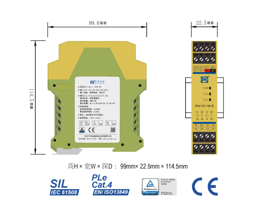 PH6101-3A1B是一款安全繼電器控制模塊,適用于急停按鈕、安全門控制開(kāi)關(guān)輸入,具有3路常開(kāi)(NO)安全輸出觸點(diǎn)和1路常閉(NC)輔助輸出觸點(diǎn)的安全繼電器。它支持單、雙通道操作,手動(dòng)或自動(dòng)復(fù)位,并具有通道間短路監(jiān)控功能。