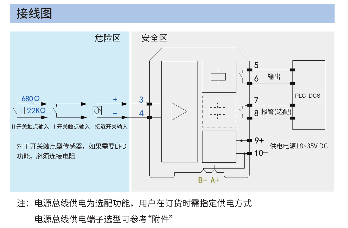 | 適用的現(xiàn)場設備 | 干接點或符合DIN19234標準的NAMUR型接近開關(guān)輸入等現(xiàn)場設備 |
