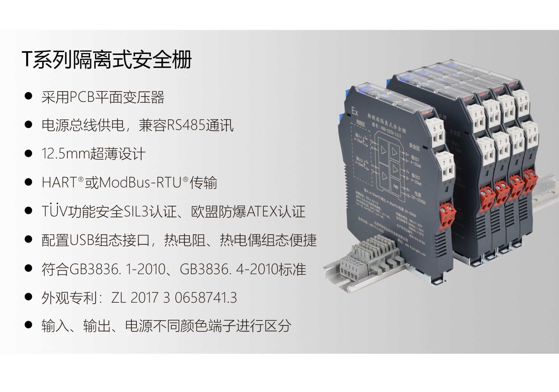 北京平和T系列智能型隔離式安全柵是本質(zhì)安全型儀表防爆結(jié)構(gòu),應(yīng)用于工藝控制參數(shù)要求高、干擾幅度大及干擾頻繁的場合。產(chǎn)品采用PCB平面變壓器和領(lǐng)先的低功耗設(shè)計,12.5mm超薄外觀,符合GB3836.1-2010和GB3836.4-2010標準,獲得德國萊茵TÜV功能安全SIL3等級認證、歐盟防爆產(chǎn)品ATEX認證及IECEx國際電工委員會防爆電氣產(chǎn)品認證等。